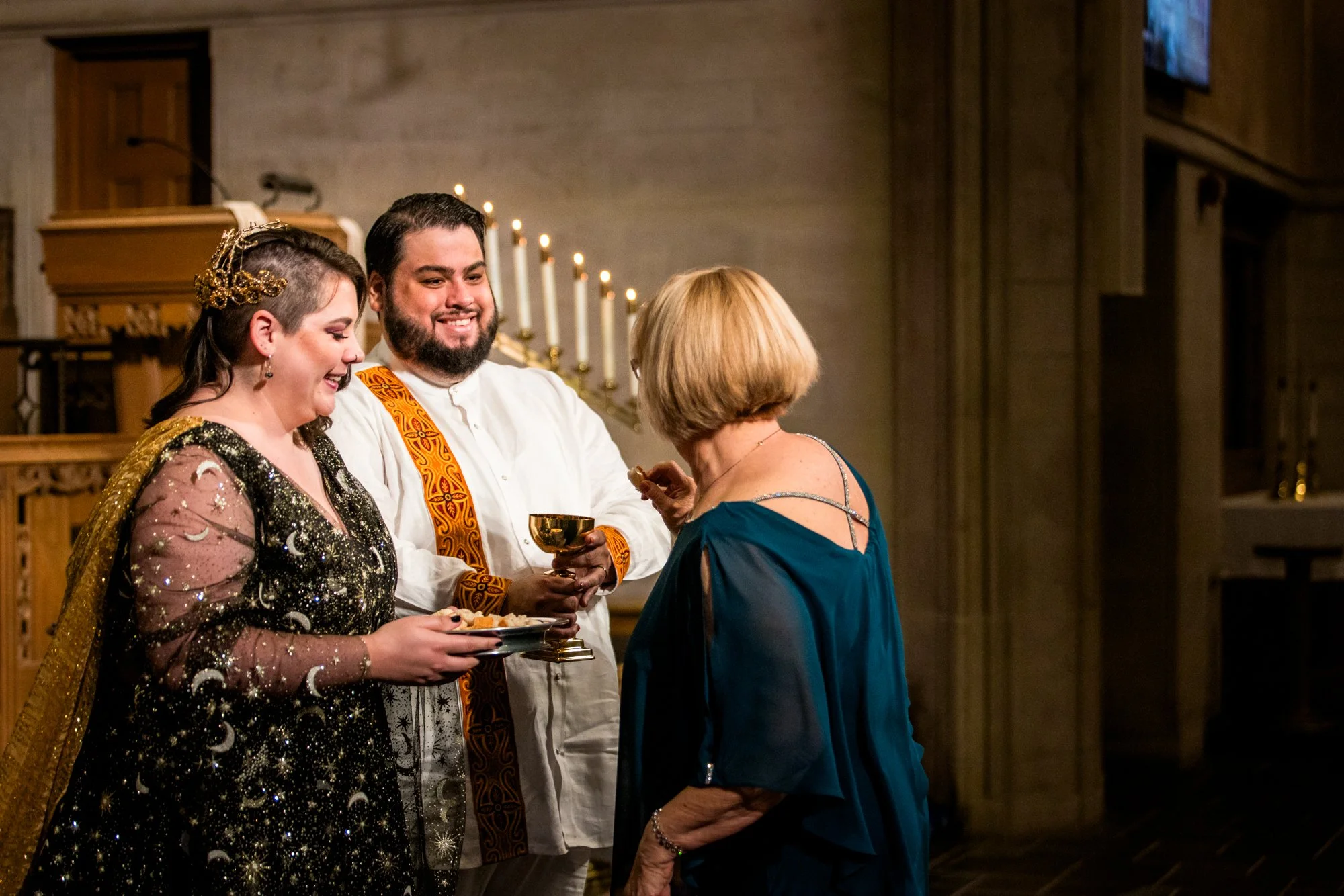 Genuine caption alert: serving communion as our first act as a couple was the best choice we could have made.